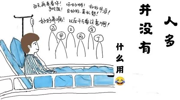 親戚或朋友住院,人們總想買些東西去看望,習(xí)慣吆喝招呼一群人呼呼啦啦地涌去病房,表一表我們的關(guān)心,或盡一盡人情世故。于是乎,衍生了這些個(gè)常見的場景: